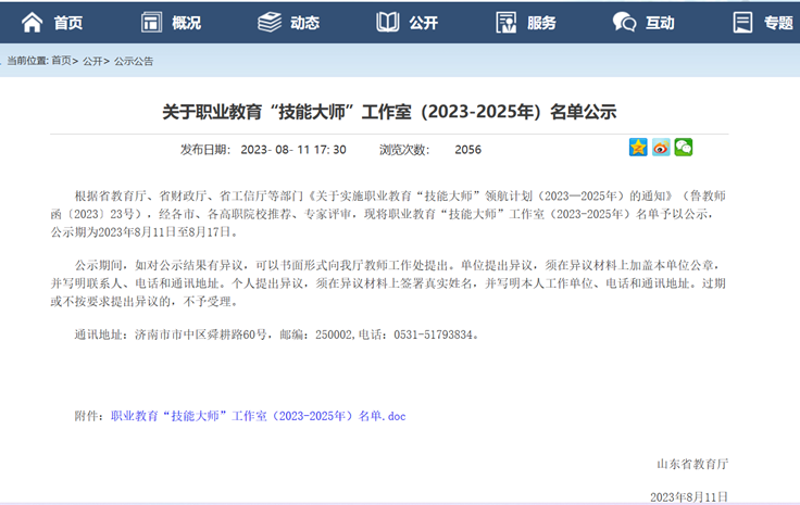 近日,山东省教育厅公布职业教育“技能大师”工作室(2023-2025年)名单,全省高职院校共115个项目入选,我校与企业“德州嘉护康养发展有限公司”和“华能国际电力股份有限公司德州电厂”联合申报的两个项目榜上有名。
